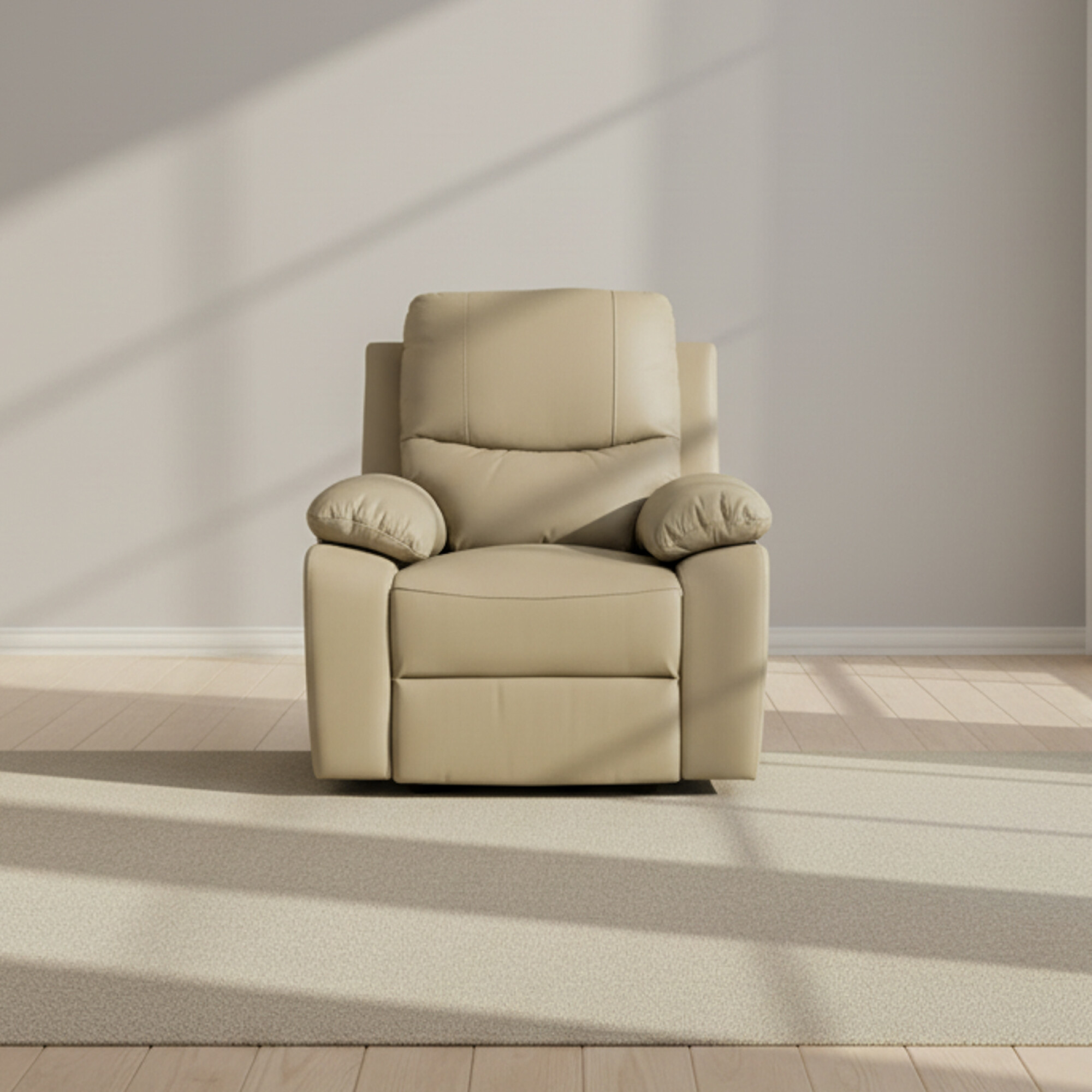 Sofa reclinable de 1 cuerpo con apertura manual, tapizado 100% en cuero de bufalo. Relleno de espuma de alta densidad y resortes espirales. Peso máximo que resiste por asiento 120 kg. MANTENIMIENTO: - No exponer a luz solar directa ni a fuentes de calor - No utilizar productos a base de solventes o cualquier otro producto abrasivo - La utilización de productos de limpieza inadecuados puede resecar el cuero y causar daños irreparables LIMPIEZA: - Líquidos deben ser removidos inmediatamente con un paño seco - Limpieza regular debe ser efectuada con un paño seco limpio - Para suciedades más severas utilizar un paño limpio humedecido en agua y jabón neutro
