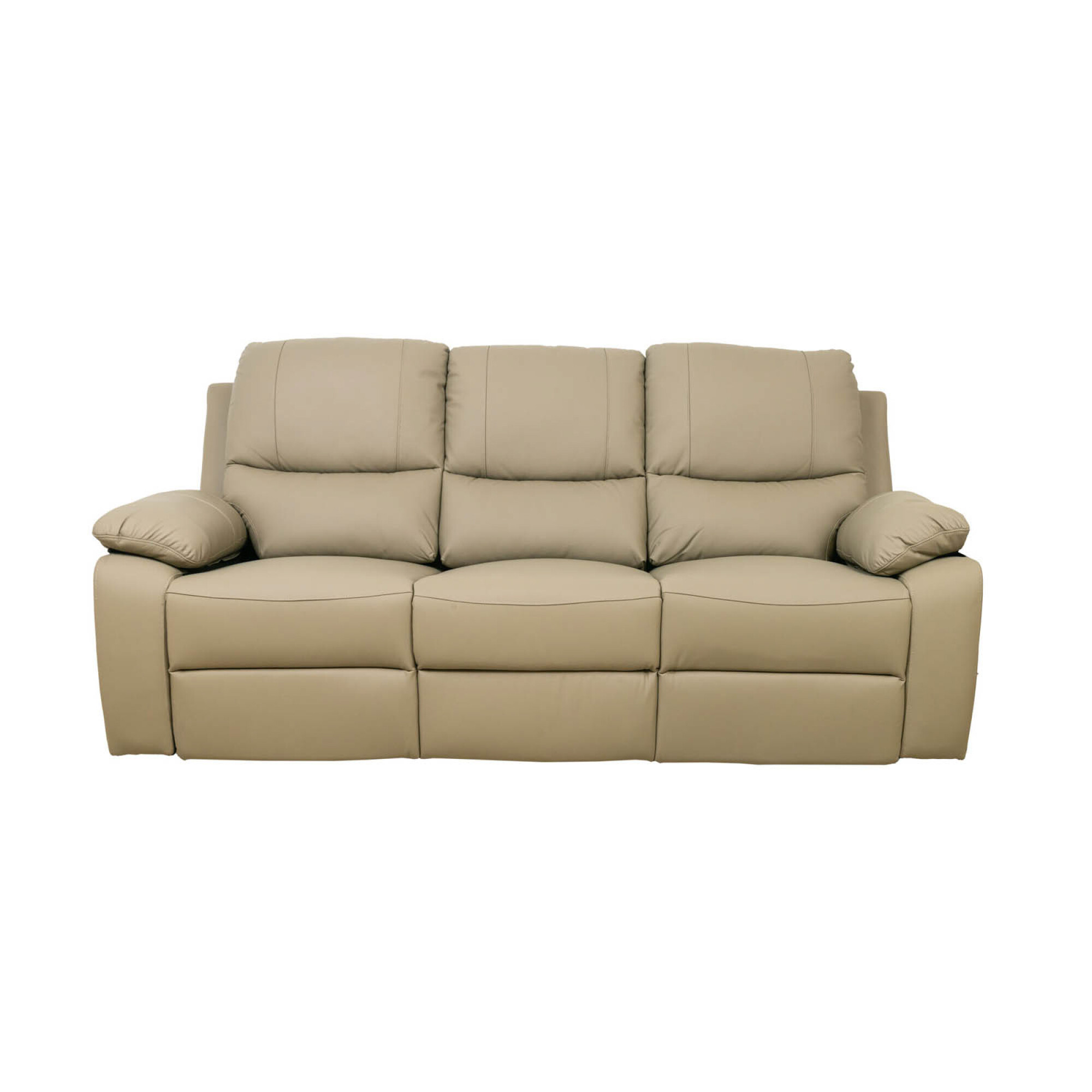 Sofa reclinable con apertura manual, tapizado 100% en cuero de bufalo. Relleno de espuma de alta densidad y resortes espirales. Peso máximo que resiste por asiento 120 kg. MANTENIMIENTO: - No exponer a luz solar directa ni a fuentes de calor - No utilizar productos a base de solventes o cualquier otro producto abrasivo - La utilización de productos de limpieza inadecuados puede resecar el cuero y causar daños irreparables LIMPIEZA: - Líquidos deben ser removidos inmediatamente con un paño seco - Limpieza regular debe ser efectuada con un paño seco limpio - Para suciedades más severas utilizar un paño limpio humedecido en agua y jabón neutro
