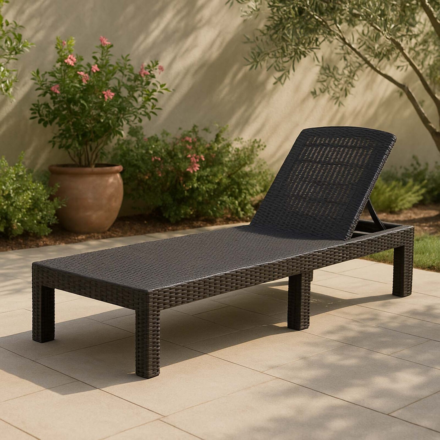 Reposera plegable en simil rattan en color negro, fabricada en polipropileno de alta calidad. Resistente, liviana y muy práctica para trasladar y/o guardar, lo que hace que sea ideal para todo tipo de espacio exterior. Medidas: 180*60*30cm Utilizar paño húmedo y jabón neutro para la limpieza. Retirar el polvo con paño seco. No utilizar productos abrasivos