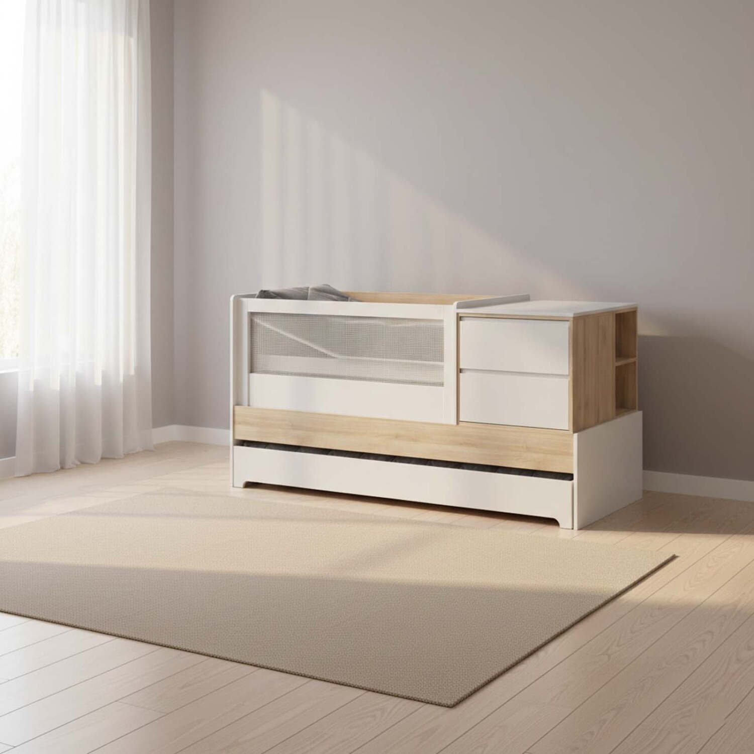 La cuna convertible ROCKY acompañara el paso del tiempo. En la fase de cuna, este producto cuenta con 2 ajustes de altura para la plataforma y un exclusivo sistema antirreflujo neumático que inclina la plataforma, evitando así el reflujo del bebé. Todavía en la fase de cuna, el producto tiene una cómoda acoplable con 2 cajones con rieles telescópicos y espacio para un cambiador. En su parte inferior hay una cama auxiliar con ruedas. Posteriormente, pueden transformar la cuna en una cama individual con cama auxiliar. Con las piezas restantes es posible armar un escritorio, aumentando así su vida útil. Fabricada en MDF y madera de pino, con acabado en laca UV. Colchón sugerido para cuna: 70*130cm / Colchón sugerido para cama: 88*188*16cm / Colchón sugerido para cama auxiliar: 78x188x14 cm. Peso máximo cuna: 35kg/Peso máximo cama: 100kg.