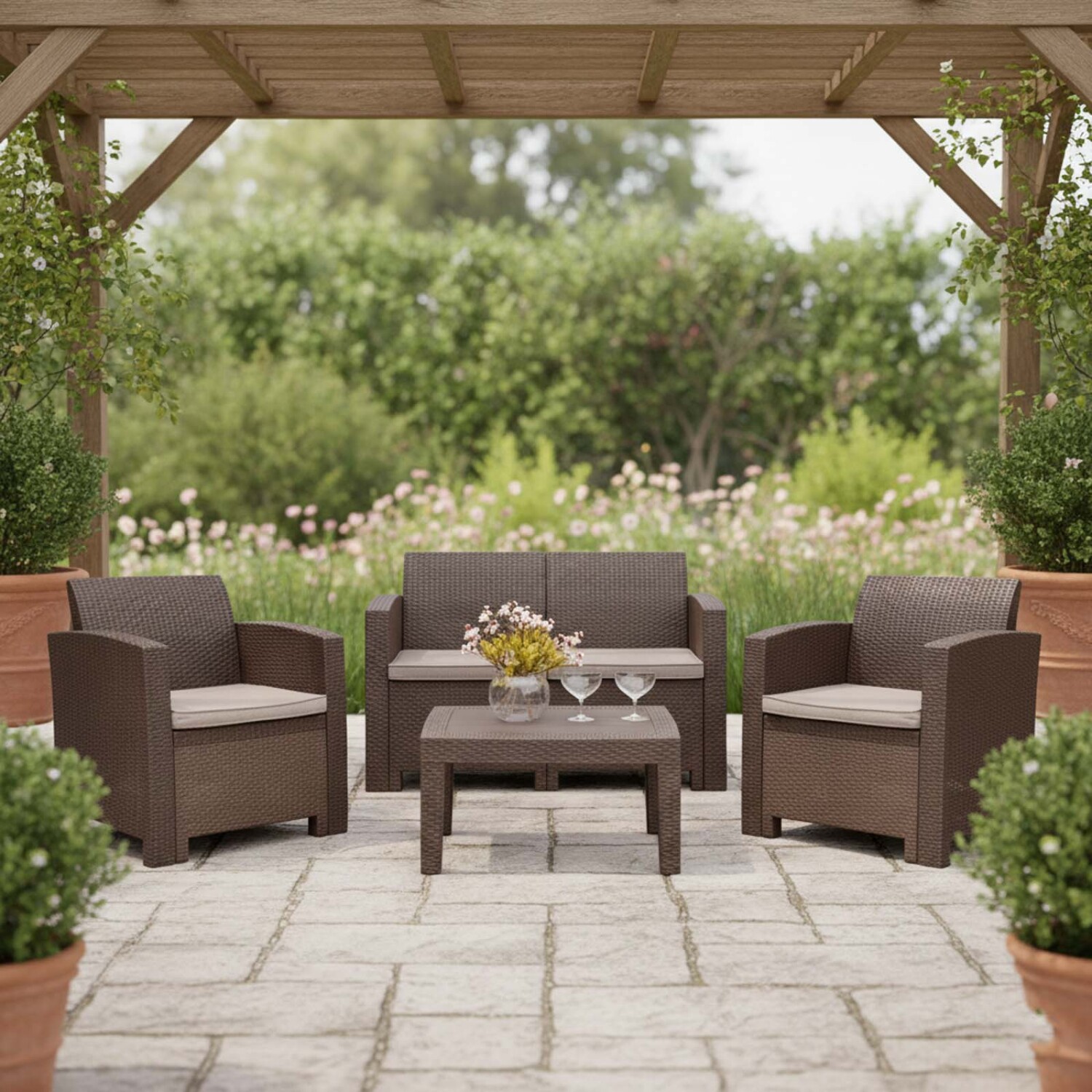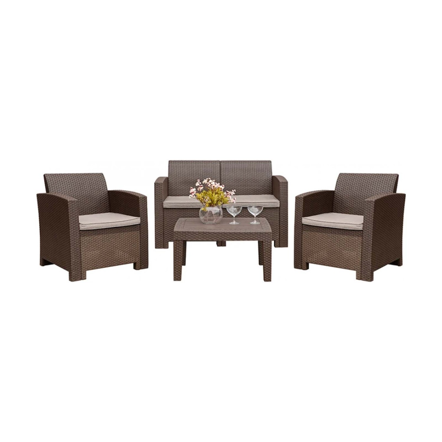 Sofá de 2 cuerpos (120x65.6x76cm), 2 butacas (68x65.6x76 cm) y mesa central (70x50.5x38 cm) en polipropileno. Incluye almohadones.