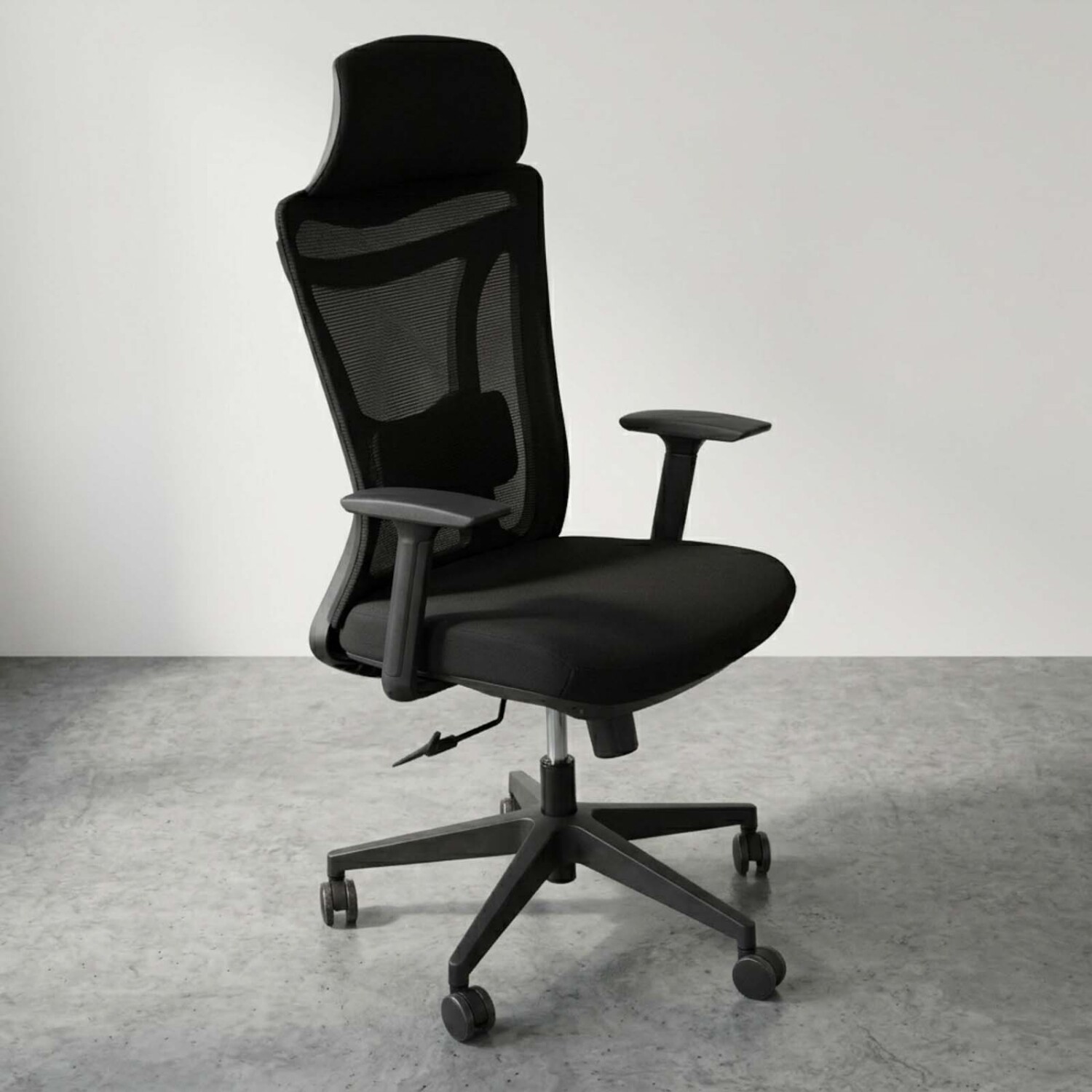 Silla de oficina giratoria con apoyacabeza y apoyabrazos. Cuenta con respaldo en malla que favorece la ventilación y estructura y apoyabrazos en polipropileno.