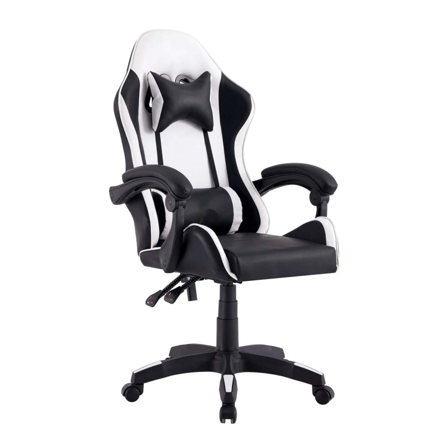 Silla gamer envolvente con respaldo alto y soporte lateral. Inspirado en los asientos de automóviles de carreras. Diseño en dos tonos y tapizado en cuero sintético. Altura asiento regulable, sistema reclinable y giro el asiento 360°. Almohadones desmontables para la cabeza y la espalda para un soporte adicional.