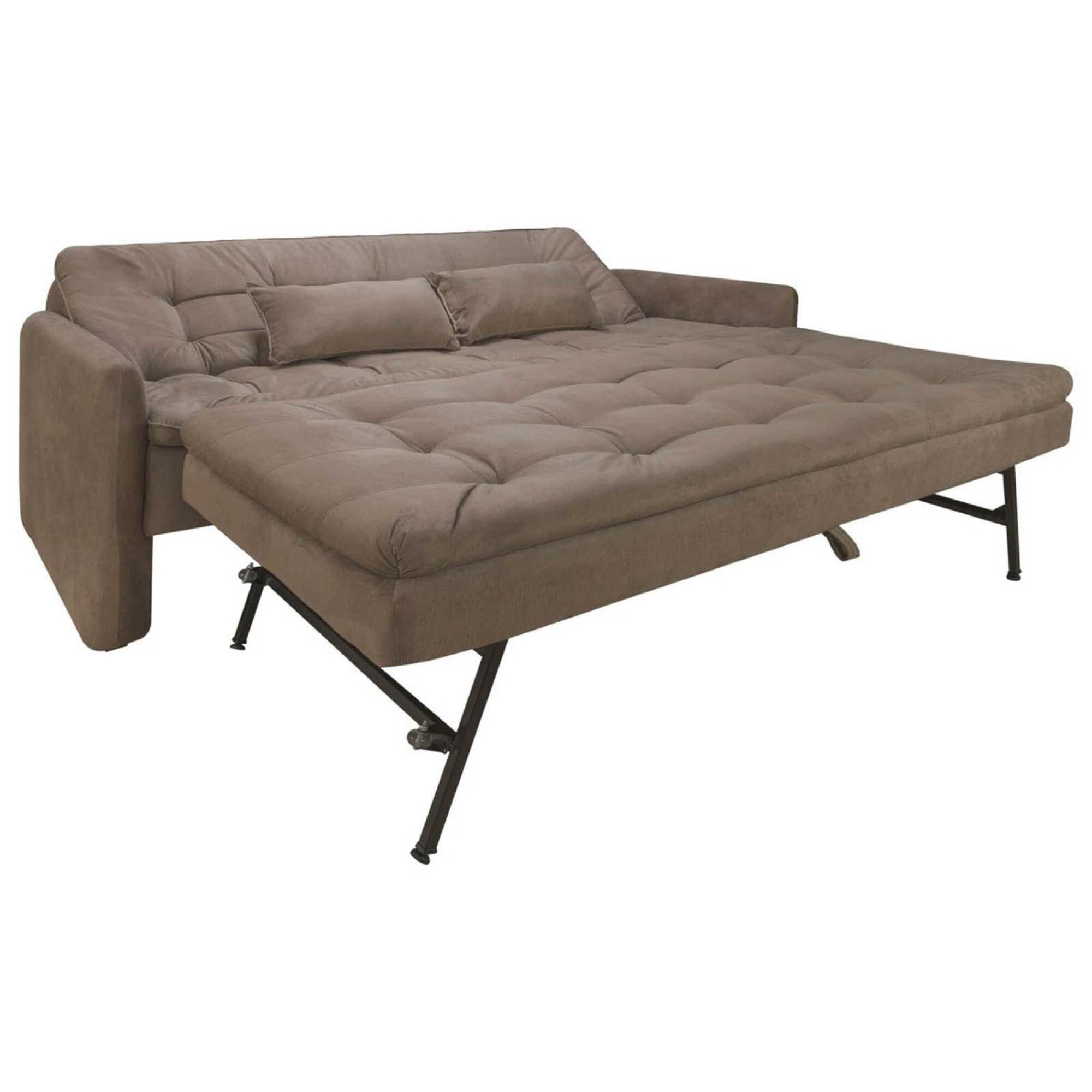 Sofá confeccionado 100% en tela poliéster. Apertura manual, con cama marinera de 1 plaza o como extensión del sofá, con patas de metal. Respaldo con 3 posiciones. Relleno espuma densidad 26 kg/m3 y estructura en madera de eucaliptus. Patas de plástico. Medidas cama: 180x115 cm.50cm de altura del piso al asiento. Material de la estructura hecho en madera + chapa de compensado, con espuma D26 + asiento y respaldo de fibra de silicona, espuma D23 en apoyabrazos y cintas elásticas.