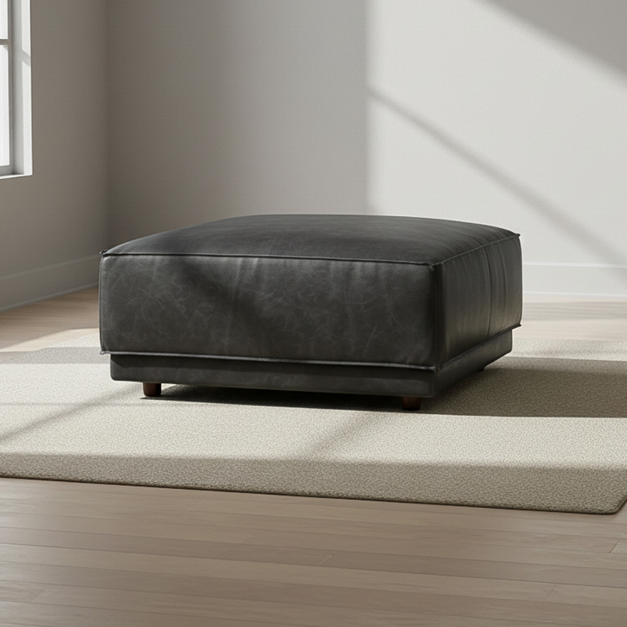 Puff 100% Cuero. Material de la estructura hecho en madera + chapa de compensado, con espuma densidad 30 soft, manta fibra siliconada, resorte zig zag y patas en madera.