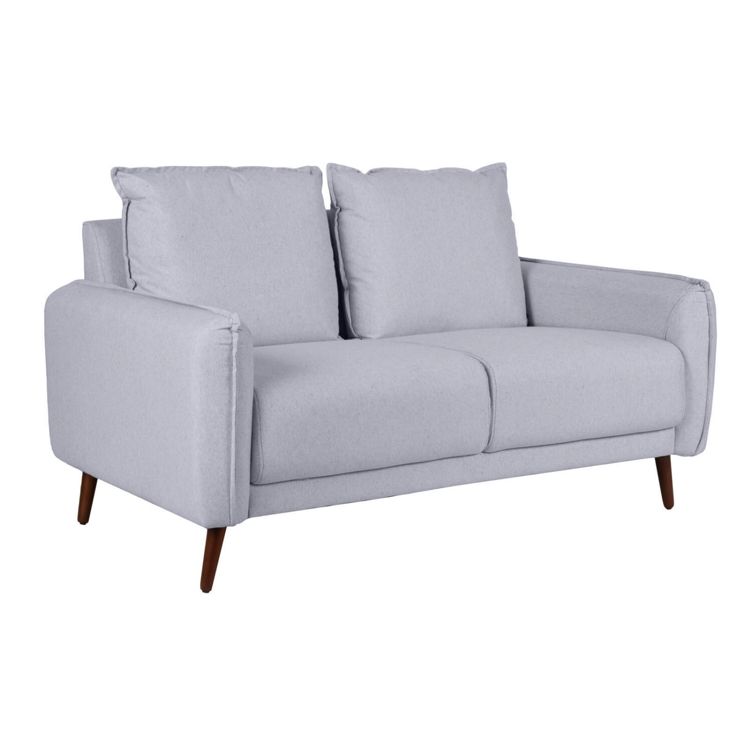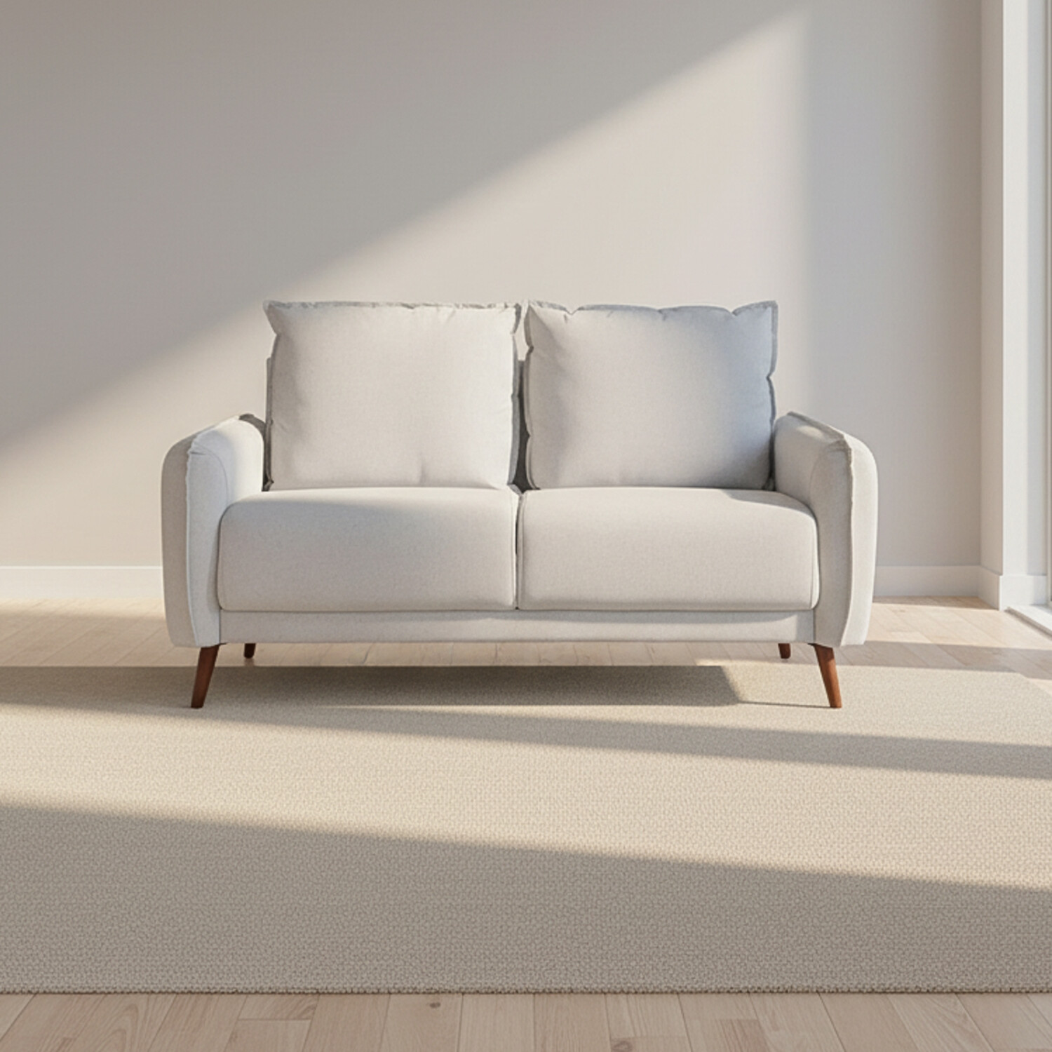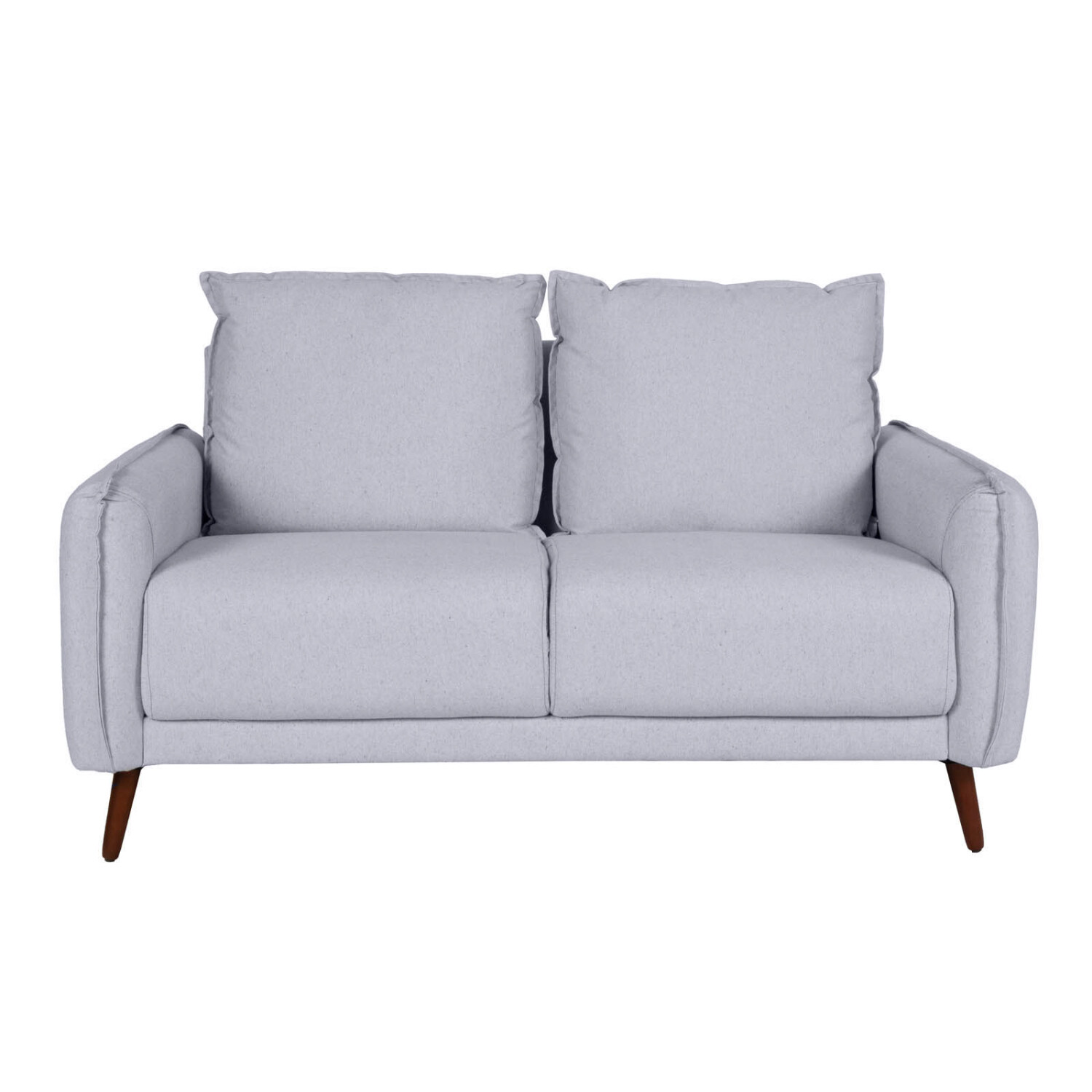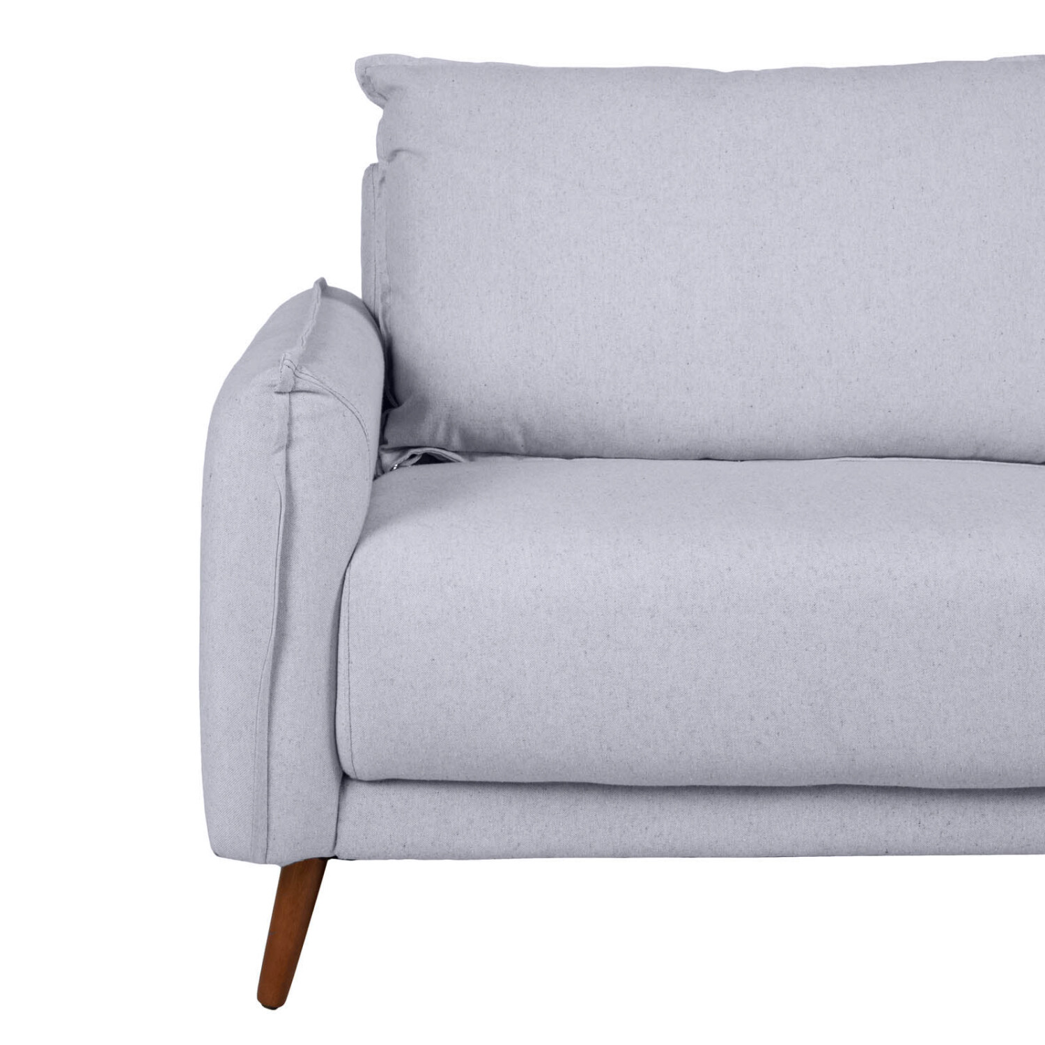 Sofá en tela con patas de madera. Material de la estructura hecho en madera, con espuma densidad 23 + soft y cintas elásticas. 47cm de altura del piso al asiento.