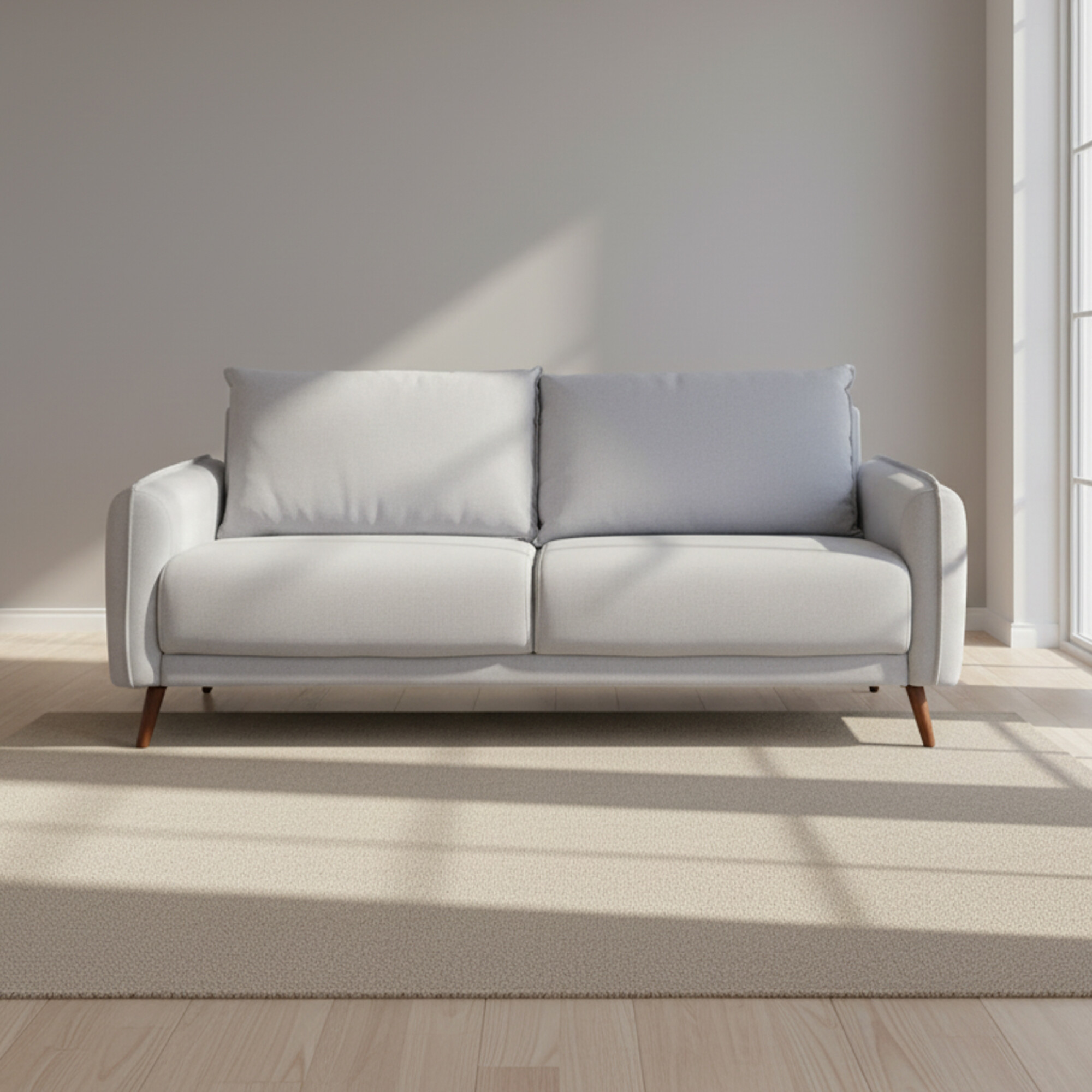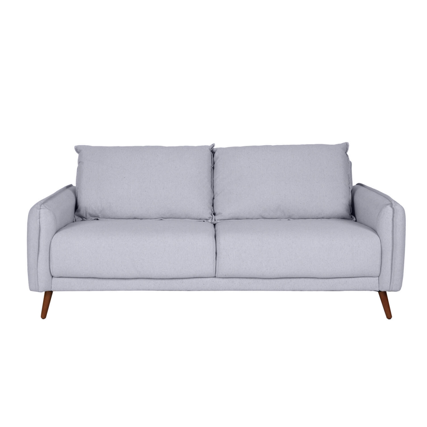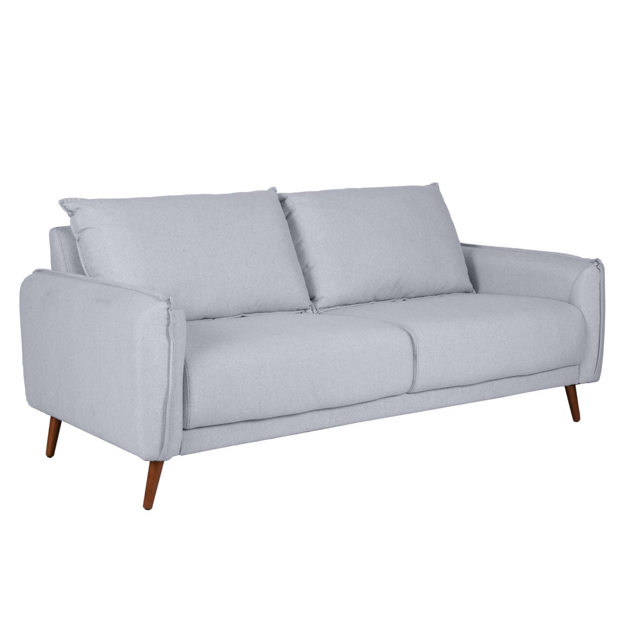 Sofá en tela con patas de madera. Material de la estructura hecho en madera, con espuma densidad 23 + soft y cintas elásticas. 47cm de altura del piso al asiento.