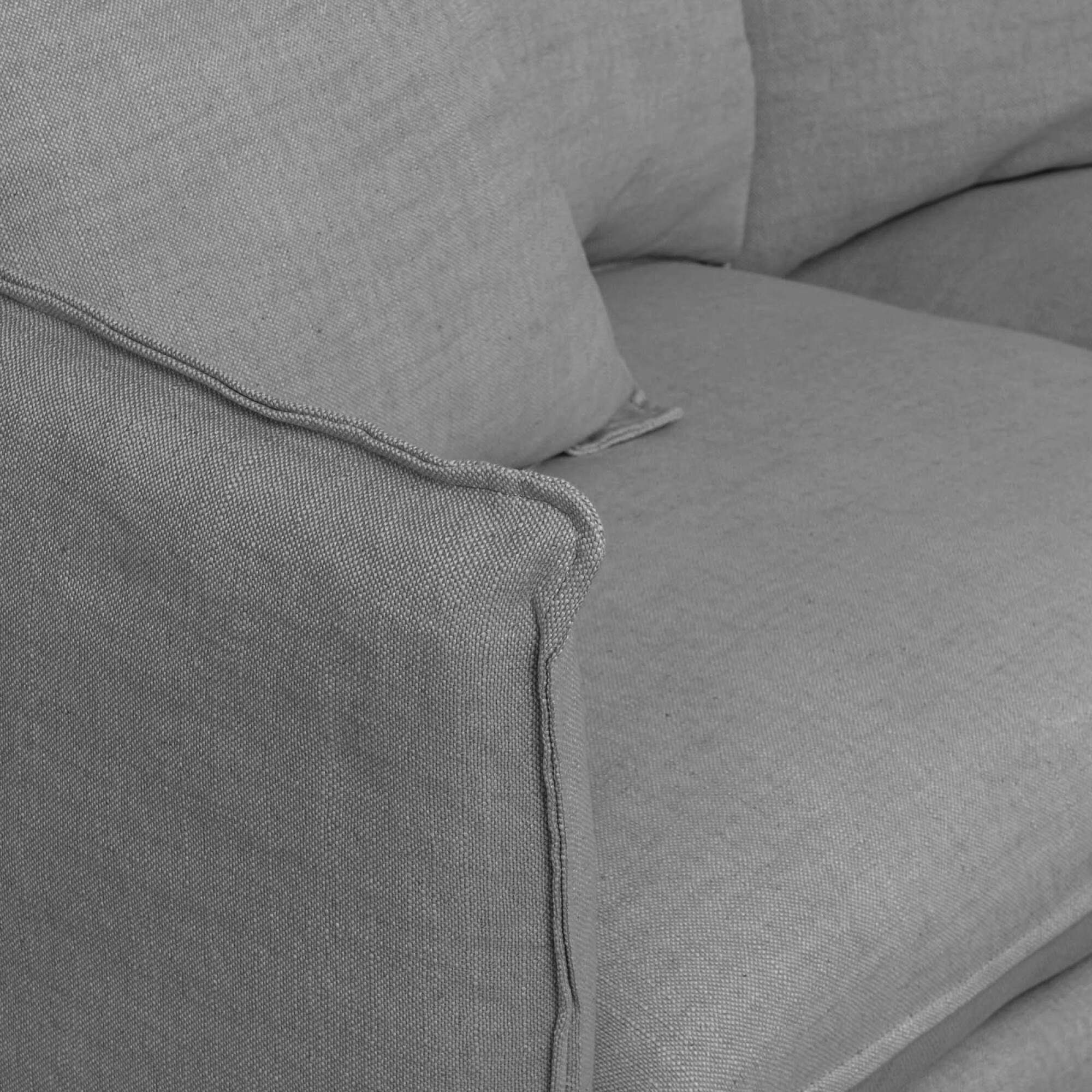 Sofá 3 cuerpos tapizado en tela 100% algodón. Relleno en espuma de alta calidad y fibra. Estructura en madera de pino y patas en madera de caucho. 52cm de altura del piso al asiento.