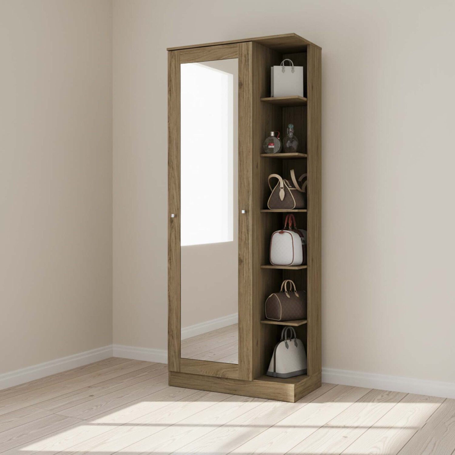 La zapatera de 1 puerta MDP marrón rústico ofrece una solución práctica y estilizada para organizar tu calzado y accesorios en espacios reducidos. Con medidas de 69 cm de largo, 179 cm de alto y 38 cm de ancho, integra una puerta con espejo de cuerpo entero que facilita el arreglo diario, 6 estantes interiores para distribuir distintas zapateras y una estantería exterior que puedes armar al lado derecho o izquierdo según tus necesidades. Fabricada en MDP y en color rústico, combina resistencia, funcionalidad y un estilo que aporta calidez al ambiente, convirtiéndola en una opción atractiva y conveniente para tu hogar.