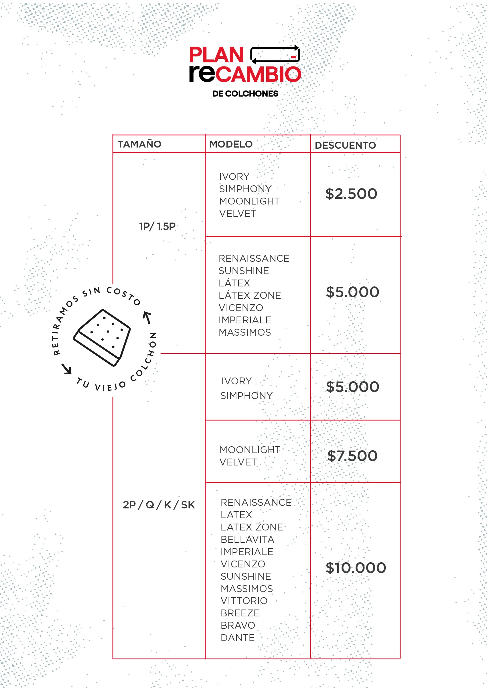 | PLAN RECAMBIO DE COLCHONES 1. Vigencia y alcance El Plan Recambio de Colchones de DIVINO aplica en todas las tiendas DIVINO del país y en compras realizadas a través del sitio web www.divino.com.uy, desde el 23/4/2026 hasta o hasta agotar stock. 2. Beneficio Con la compra de los modelos y plazas indicados a continuación se accede al descuento señalado:
